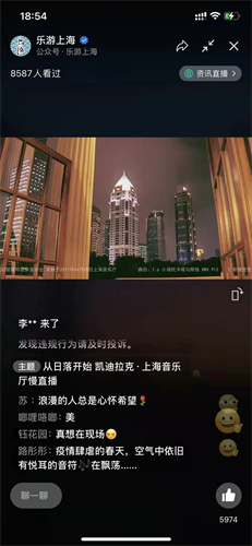 从3月19日起,上海音乐厅每天在日落前1小时开始直播,画面视角来自音乐厅二楼的西面阳台,对准的正是城市草坪远处的天空和楼宇。天气晴好时,网友可以看到落日与霞云,天色一点一点暗去,街灯一盏一盏亮起,配以上海音乐厅往年音乐会现场录音音频,以一种独特的方式给疫情下居家的市民朋友给予治愈慰藉。